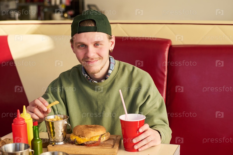 Портрет молодого белого мужчины, ест бургер и картошку фри в ресторане
