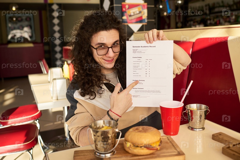 Портрет молодого студента, показывающего академическую запись семестра в столовой