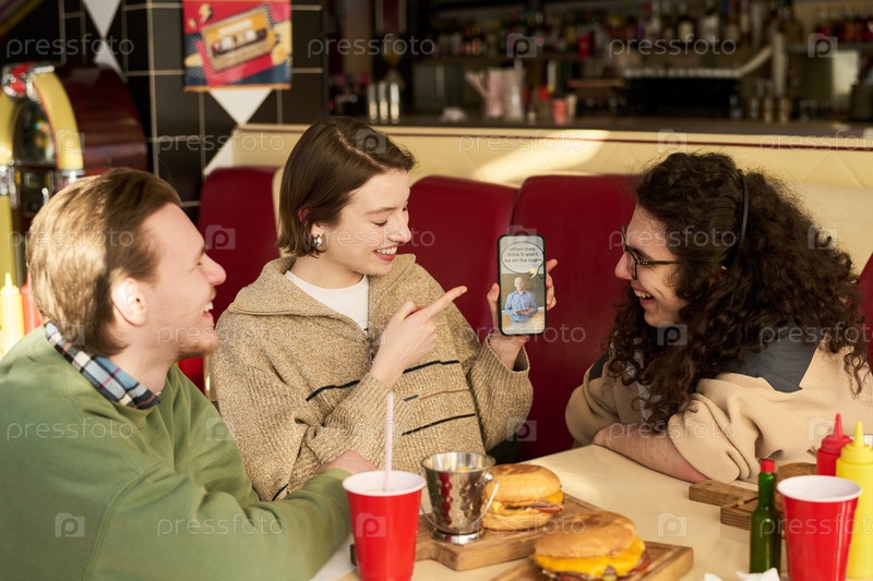 Молодая женщина показывает смартфон друзьям, смеясь вместе