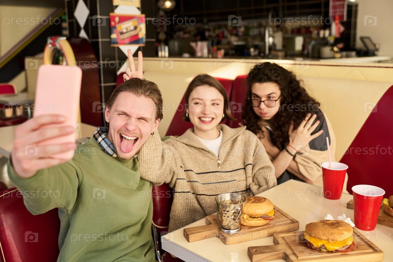 Группа друзей поколения Z, которые делают селфи и смешные лица в ресторане