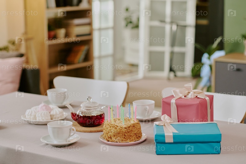 Рождественский торт со свечами и упакованными подарками, расположенные на обеденном столе