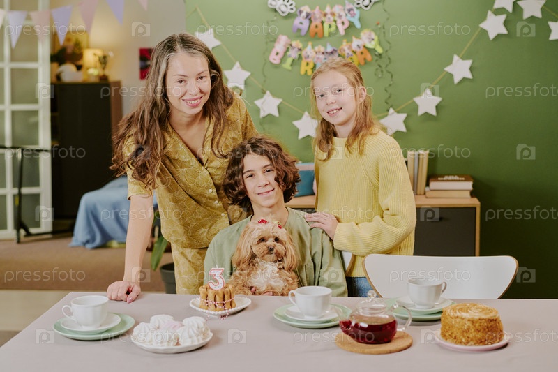 Белая женщина и двое детей улыбаются, собираясь вокруг торта на день рождения собаки