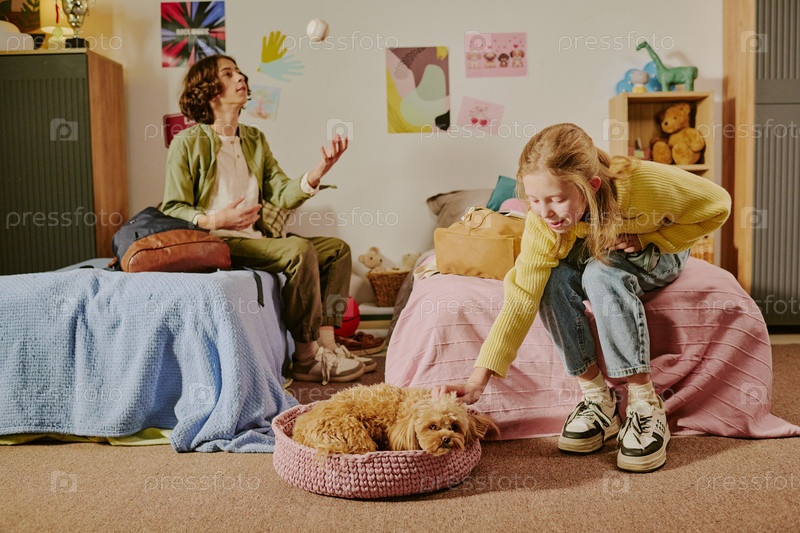 Подростковая белая девушка ласкает собаку, пока ее брат жонглирует мячом