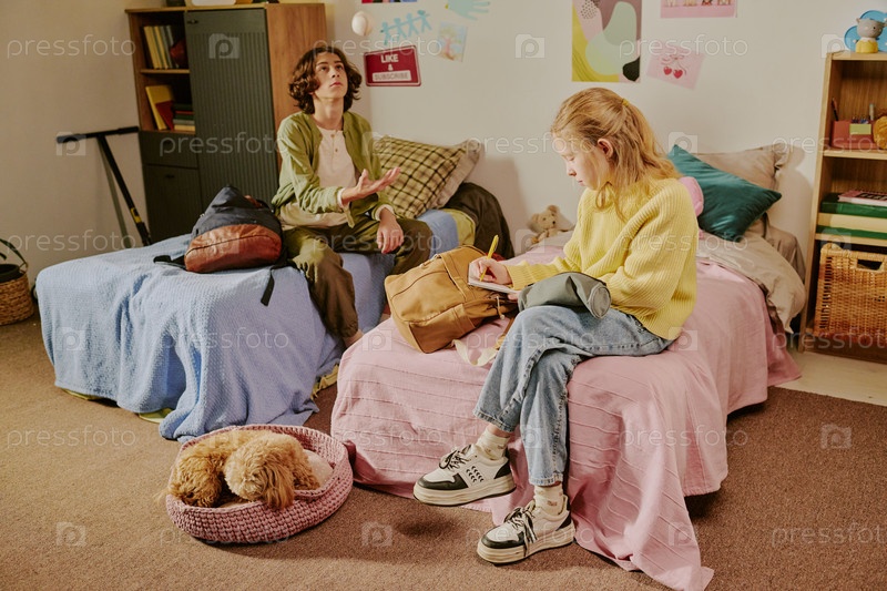 Кавказская девочка-подросток пишет в блокноте, пока подросток разговаривает поблизости