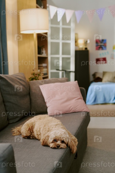 Вертикаль пушистой собаки, отдыхающей на диване в уютном современном интерьере гостиной