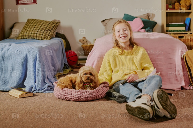 Улыбающаяся белая девушка сидит на полу, читая книгу рядом с собакой в помещении