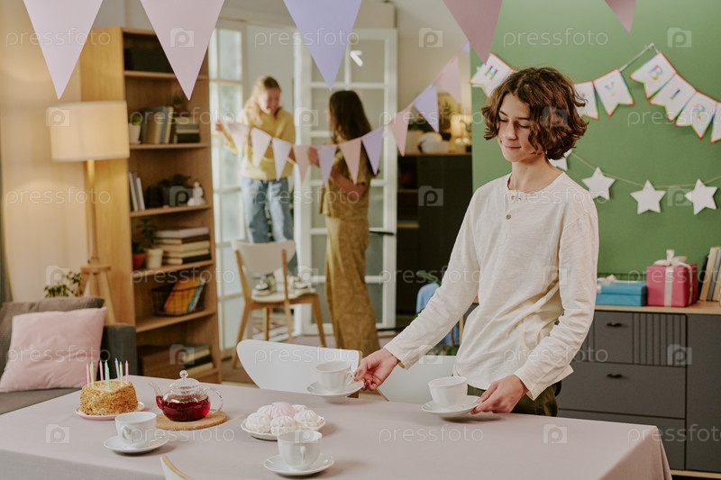 Юношеский белый мальчик устанавливает стол для празднования вечеринки по случаю дня рождения в помещении