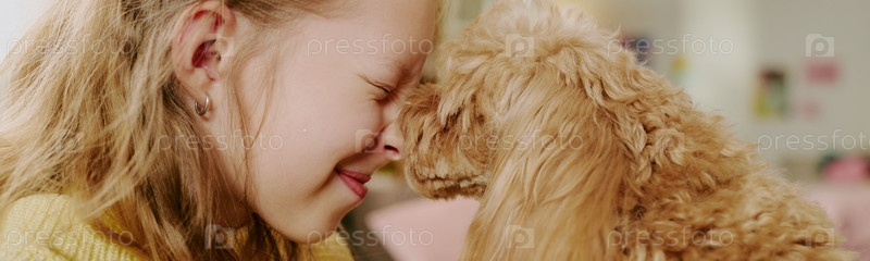 Header Image of Девочка-ребенок прикасается к носу с пушистой собакой в помещении