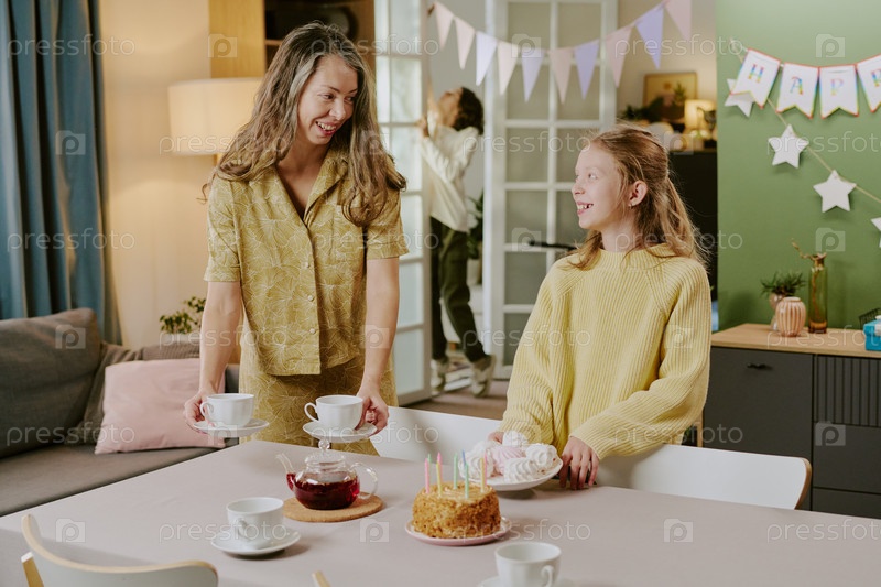Белая женщина подает чай улыбающейся белой девушке на праздновании дня рождения