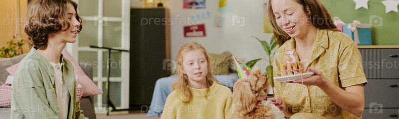 Header Image of Женщина празднует день рождения собаки с двумя детьми в помещении