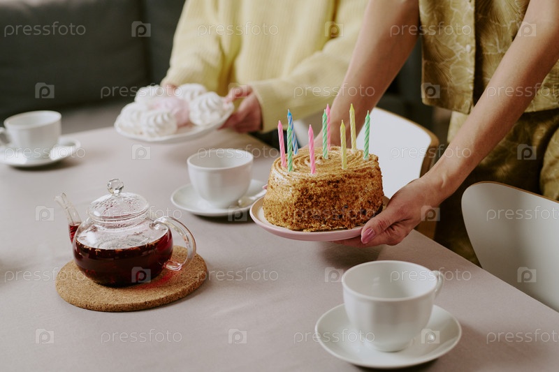 Белые женщины празднуют день рождения, подавая торт и сладости за столом