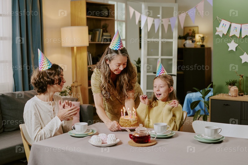 Белая женщина средних лет приносит торт на день рождения взволнованной белой девушке