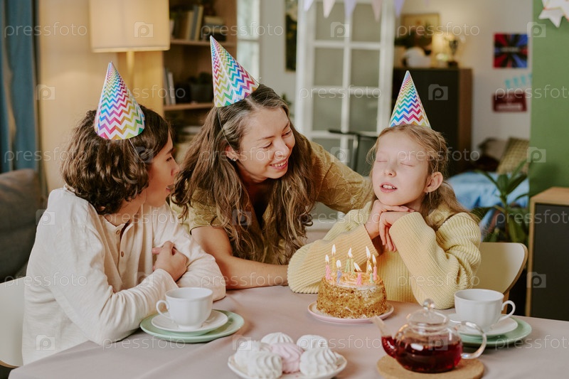 Белая женщина и двое детей празднуют день рождения тортом и свечами