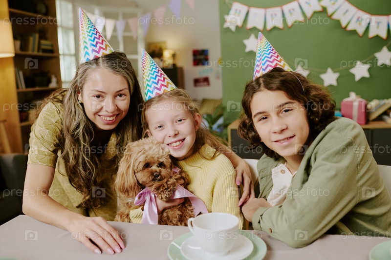 Белая женщина с двумя детьми празднует день рождения с маленькой собакой в помещении