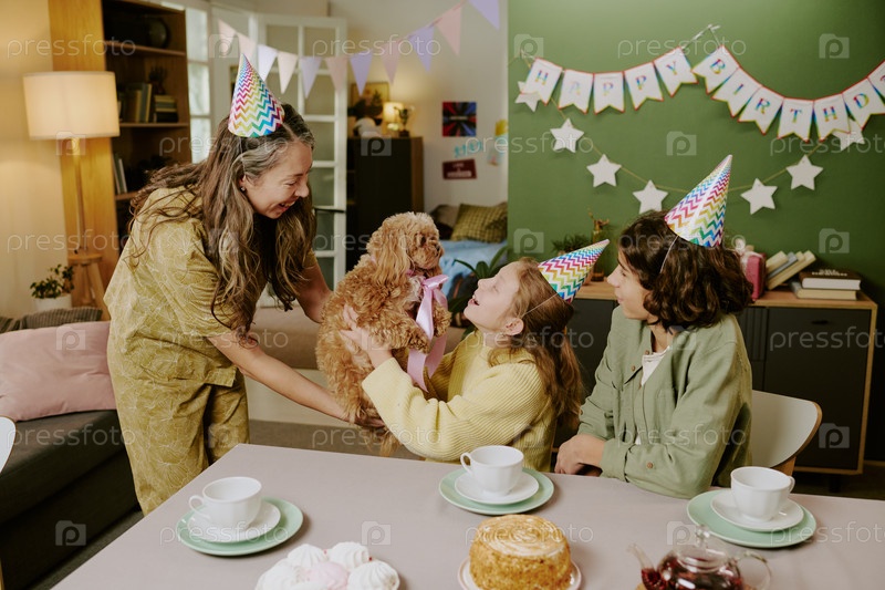 Белая женщина средних лет дарит собаку двум белым девушкам, которые празднуют день рождения