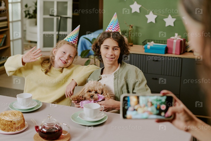 Юношеский белый мальчик и молодая белая девушка улыбаются на вечеринке по случаю дня рождения