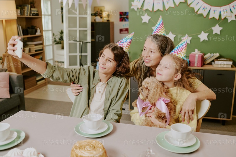 Мальчик-подросток и две девочки делают селфи во время празднования дня рождения