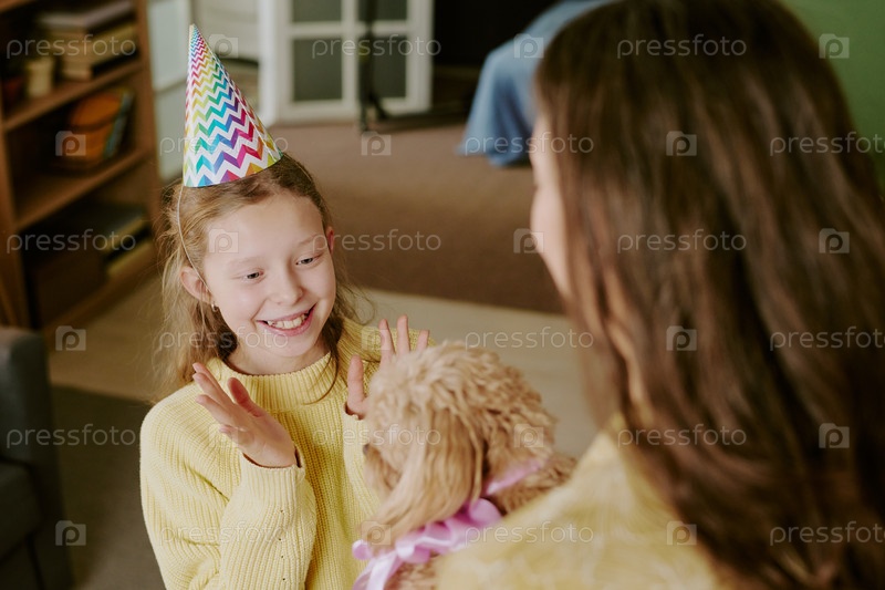 Кавказская девушка улыбается, приветствуя маленькую собаку во время празднования дня рождения