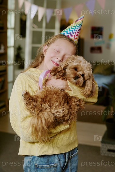 Вертикаль девушки, обнимающей собаку во время празднования дня рождения в помещении с улыбкой