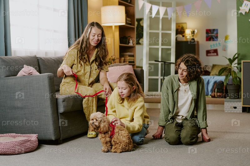 Кавказская женщина и двое детей тренируют собаку вместе в помещении дома
