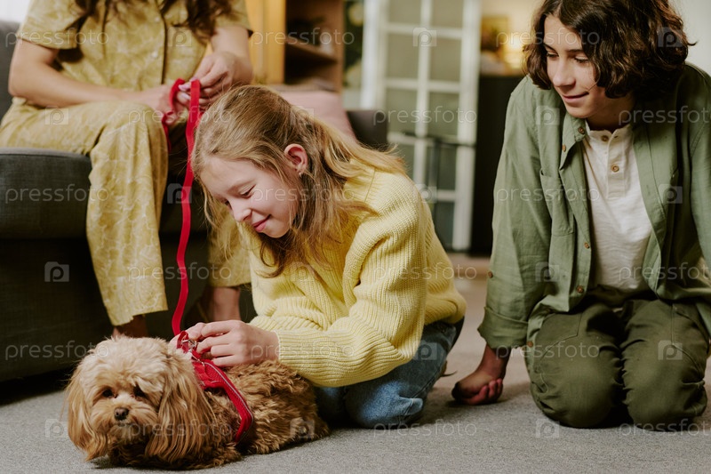 Кавказская девушка застегивает поводку на маленькой собаке, пока подросток смотрит в помещении