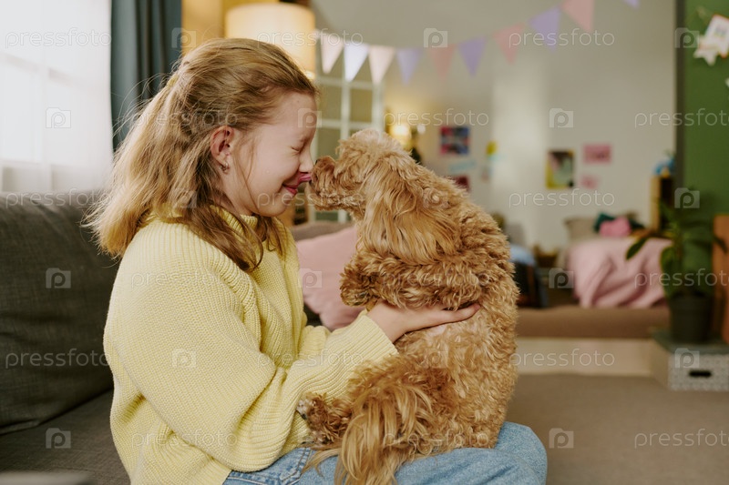 Кавказская девушка улыбается, держа в руках щенка и прикасаясь к носу внутри