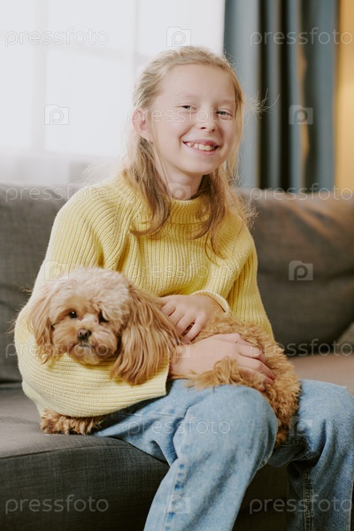 Вертикальный портрет девушки, улыбающейся, держа маленькую собаку на диване в помещении