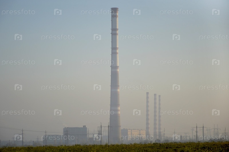 Электростанция в лучах солнца на рассвете. здания, линии электропередач и трубы промышленного объекта слегка скрыты туманной дымкой. производство электричества. выбросы газа и загрязнение воздуха