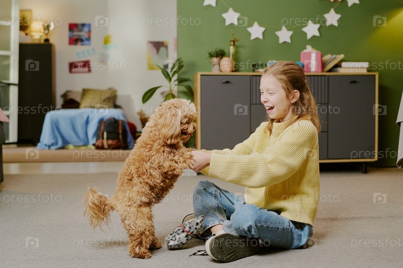 Кавказская девушка смеется, играя с собакой в уютной комнате