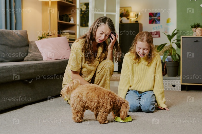 Белая женщина и молодая девушка улыбаются, глядя на собаку, которая ест в помещении