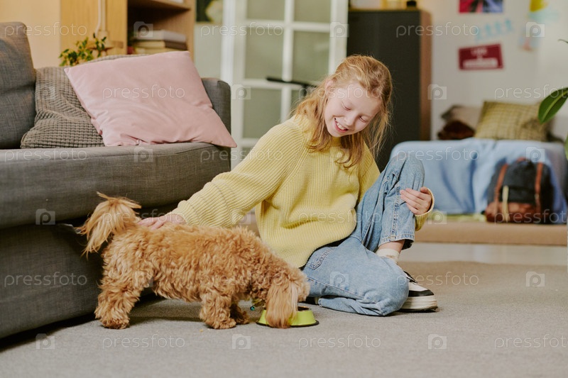 Caucasian Preteen Girl Smiling While Petting Dog Eating from Bowl Indoors Кавказская девочка-подросток улыбается, пока ласкает собаку ест из ковры в помещении