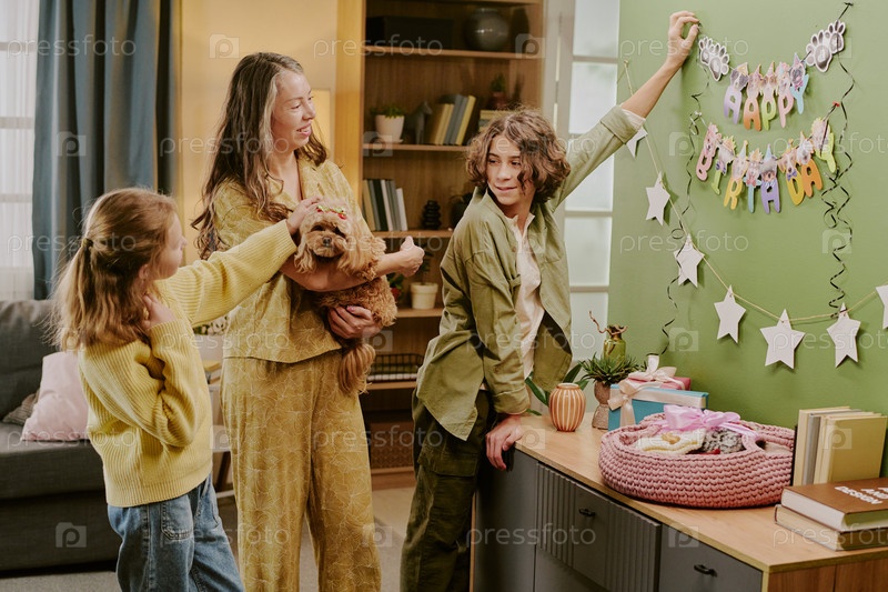 Кавказская мать с двумя детьми готовит украшения для вечеринки на день рождения в помещении