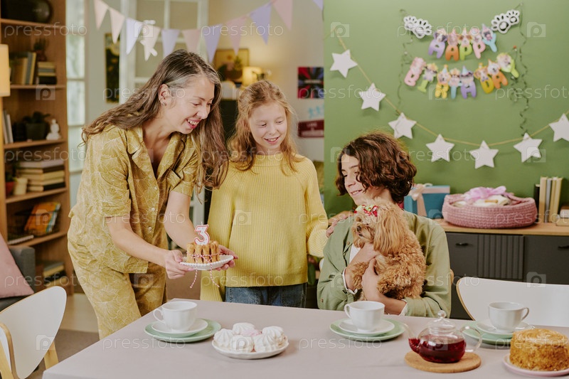 Белая женщина празднует день рождения с двумя детьми и маленькой собакой в помещении