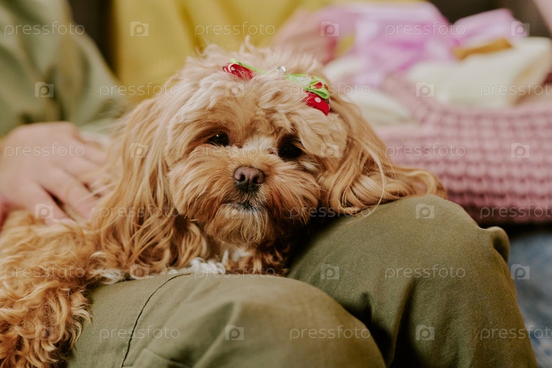 Пушистая собака отдыхает на маленьком лоне, в то время как ее мягко поглаживают внутри