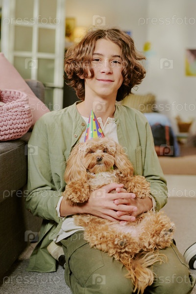 Вертикальный портрет мальчика-подростка, держащего собаку, носящей партийную шляпу в помещении