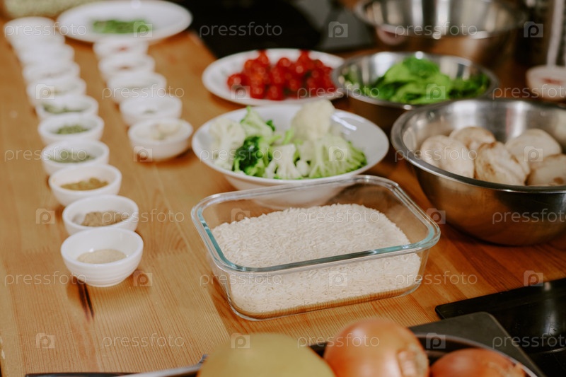 Подготовка свежих ингредиентов для уроков кулинарии на деревянном столе в условиях кухни