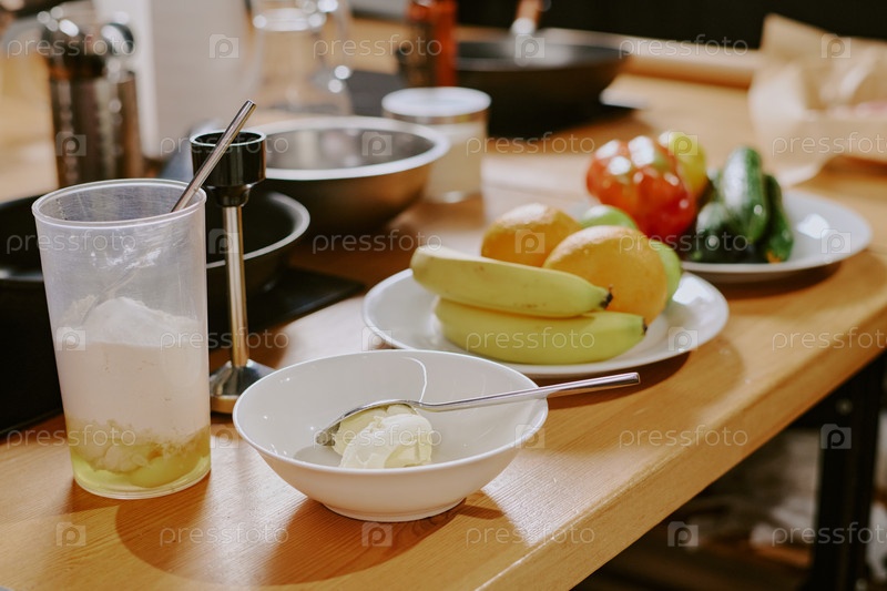 Свежие фрукты и ингредиенты, расположенные на столе во время подготовки к классу кулинарии