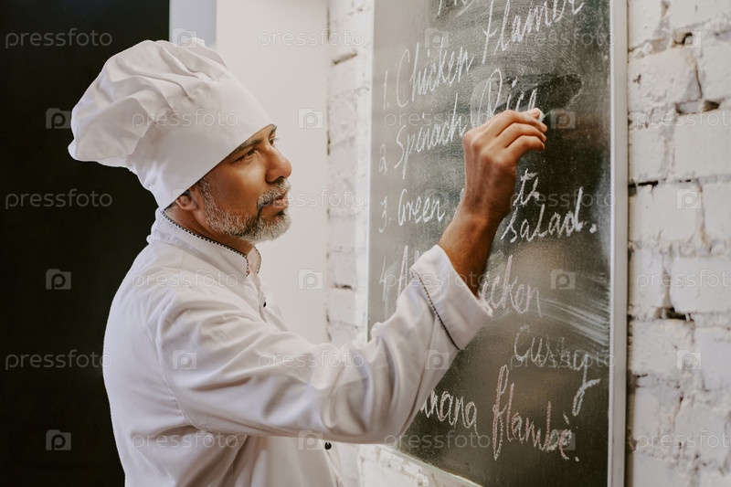 Мужчина средних лет преподает занятия по кулинарии и написанию меню на доске