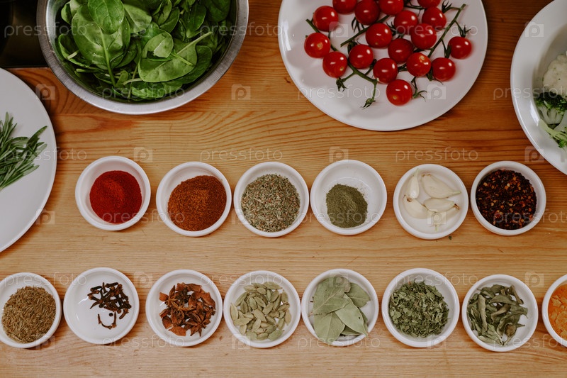 Разнообразные специи и свежие овощи устроены для подготовки к классу кулинарии