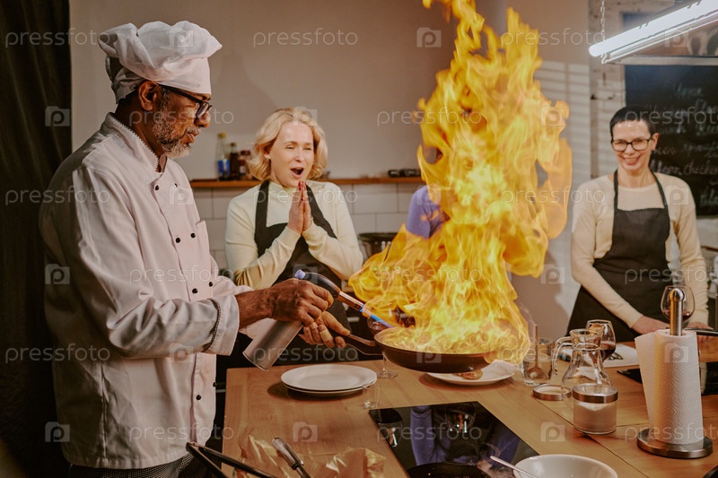 Шеф-повар демонстрирует технику Flambe во время занятий по кулинарии