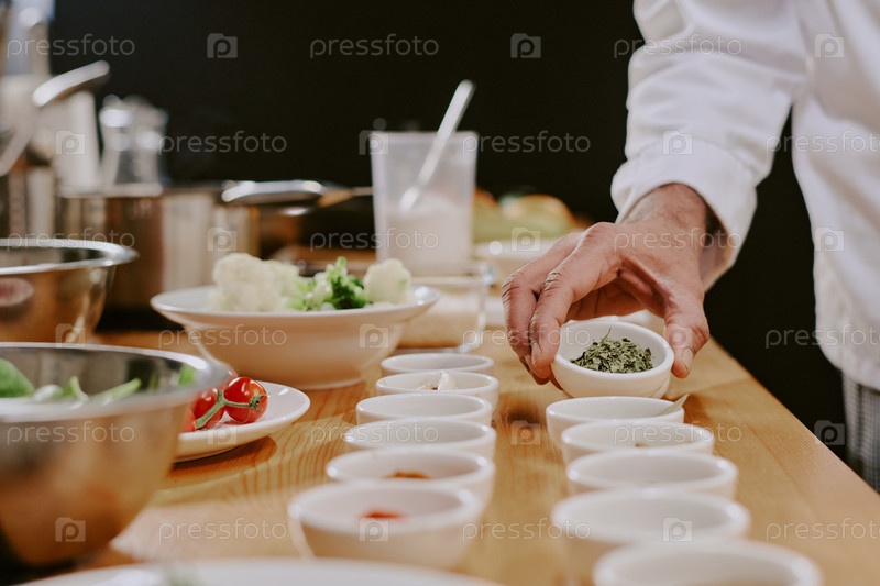 Кавказский мужчина средних лет готовит ингредиенты во время занятий по кулинарии