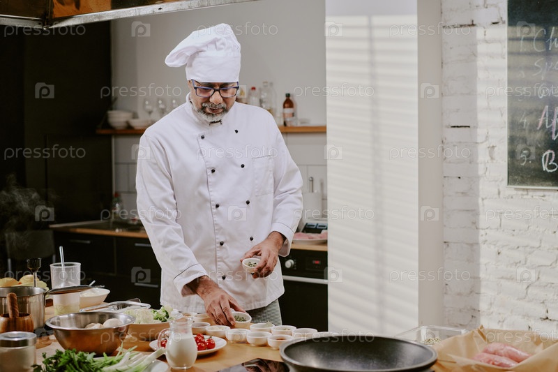 Мужчина средних лет демонстрирует выбор ингредиентов во время урока кулинарии