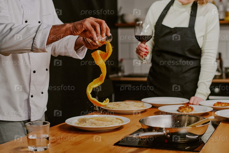 Кавказская женщина среднего возраста наблюдает за шеф-поваром, украшающим блюдо во время уроков кулинарии
