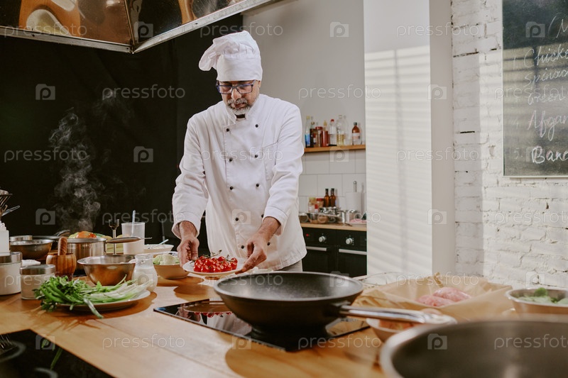 Мужчина средних лет готовит ингредиенты во время урока кулинарии