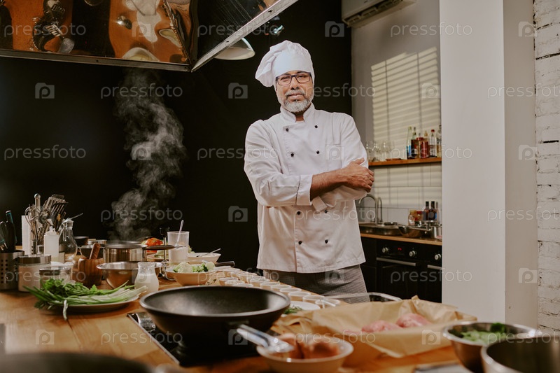 Портрет мужчины среднего возраста Шеф-повар ведущий класс кулинарии на кухне