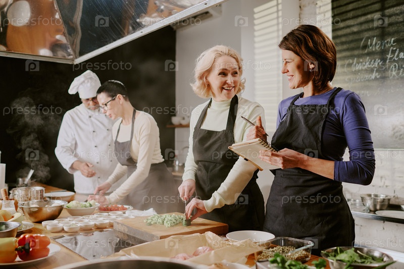 Кавказские женщины среднего возраста обсуждают методы приготовления пищи во время кулинарного занятия