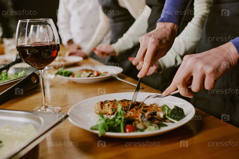 Группа неузнаваемых мужчин и женщин, готовящих еду во время урока кулинарии