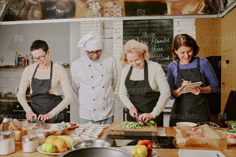 Группа белых женщин среднего возраста, посещающих занятия по кулинарии с инструктором-шефом