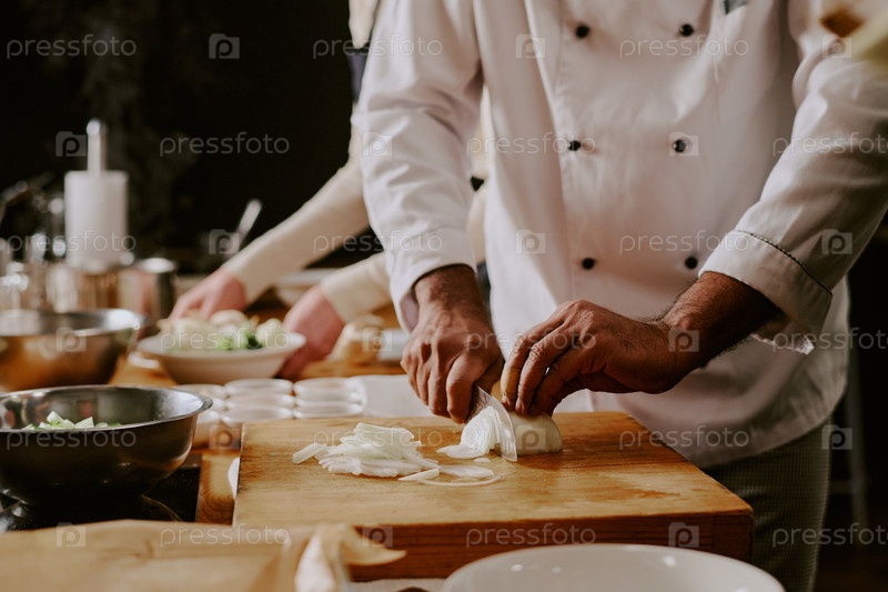 Повар среднего возраста режет лук во время подготовки к занятиям по приготовлению пищи