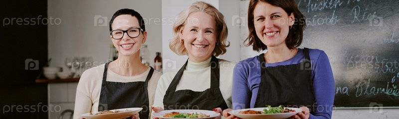 Header of Three Caucasian Women Smiling While Presenting Dishes during Cooking Class Заголовок трех белых женщин, улыбающихся во время представления блюд на уроке кулинарии